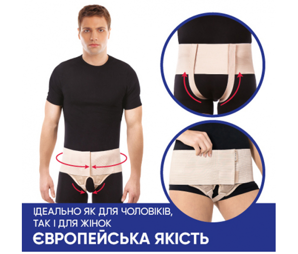 Брюшная стенка в паховой области имеет анатомические образования, которые под влиянием различных факторов внешней и внутренней среды, участвуют в процессе формирования грыжевых ворот, через которые выходит грыжа. Бандаж противогрыжевой паховый универсальный изготовлен из синтетической ткани, имеет пояс и накладки на обе паховые области, что позволяет применять его у пациентов с двусторонними паховыми грыжами. Фиксирующий элемент обеспечивает удержание накладок в паховых областях над грыжевыми воротами, а также создает внешнюю компрессию и защиту.