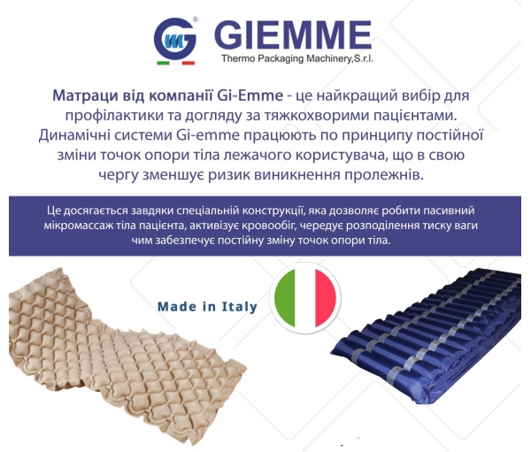 Модель секционного противопролежневого матраса Gi-emme TKS-2012 B разработана итальянской компанией Gi-emme S.R.L., которая является лидером по производству качественных противопролежневых систем в Италии. Особенно эффективна эта модель матраса для предупреждения и лечения пролежней 1-2 степени. Пользоваться им можно как в стационарных условиях больницы, так и в домашней обстановке.
