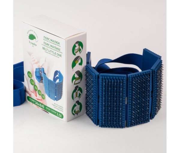 Аппликационное устройство Ляпка плоский «Пояс Малыш» состоит из 6 пластин и 2 регулируемых поясов, количество игл 960. Размер каждой пластины 36 × 84 мм. Благодаря надежным фиксаторам крепится на проблемные зоны.