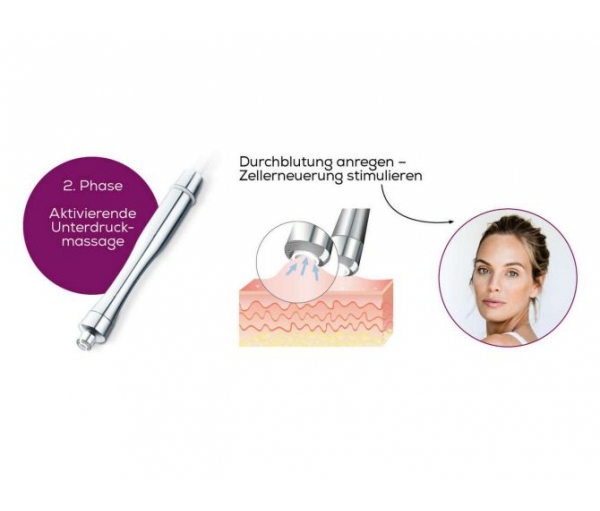 - Двойной эффект — пилинг с деликатным омоложением и отшелушиванием ороговевших клеток и активный вакуумный массаж, стимулирующий циркуляцию и клеточное обновление