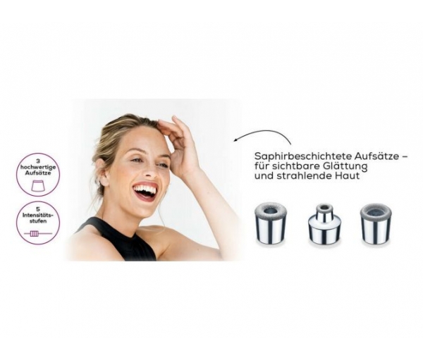 - Три высококачественных насадки с сапфировым покрытием — мягкая, жесткая и точечная — для разглаживания и эффективного пилинга